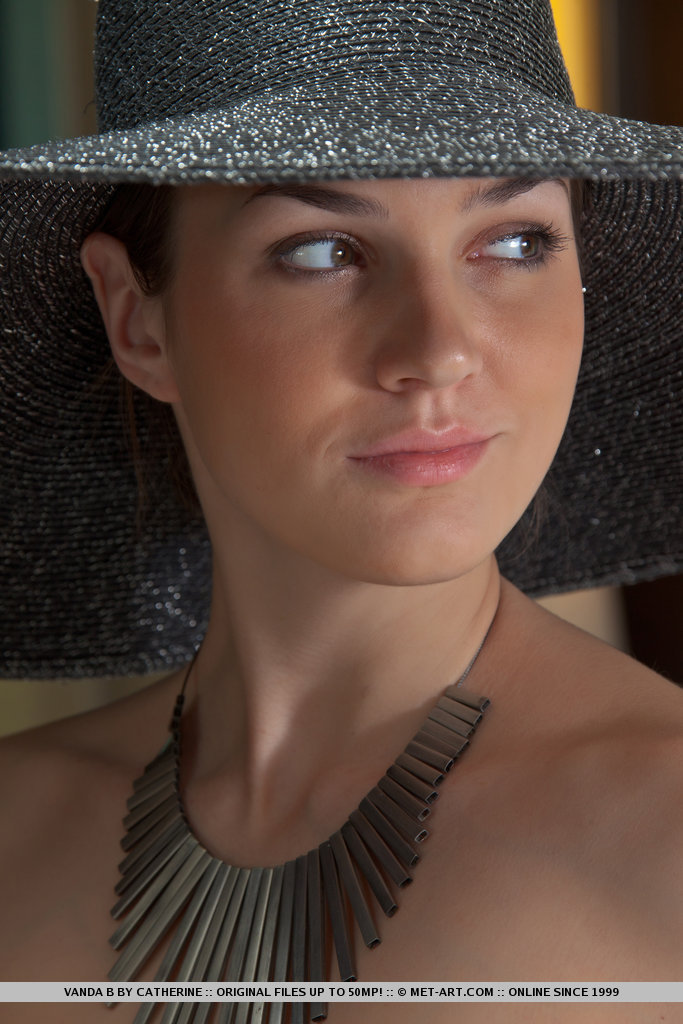 Wearing a broad brimmed hat, a chunky piece of necklace, and a sheer black panty
