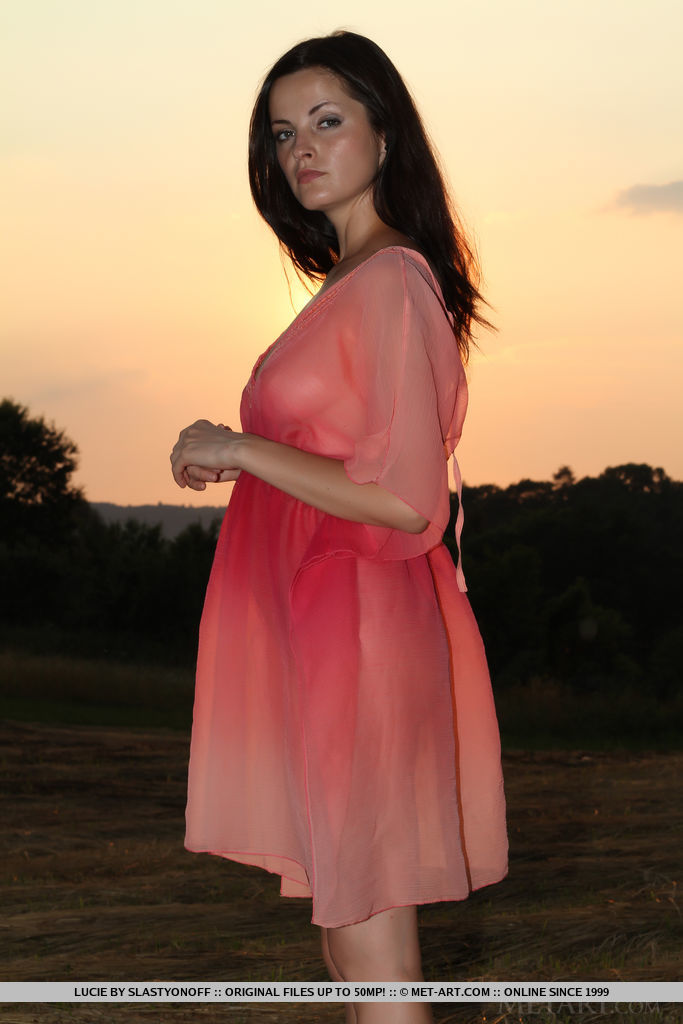 Newcomer Lucie strips outdoors baring her sweet tits and trimmed pussy.